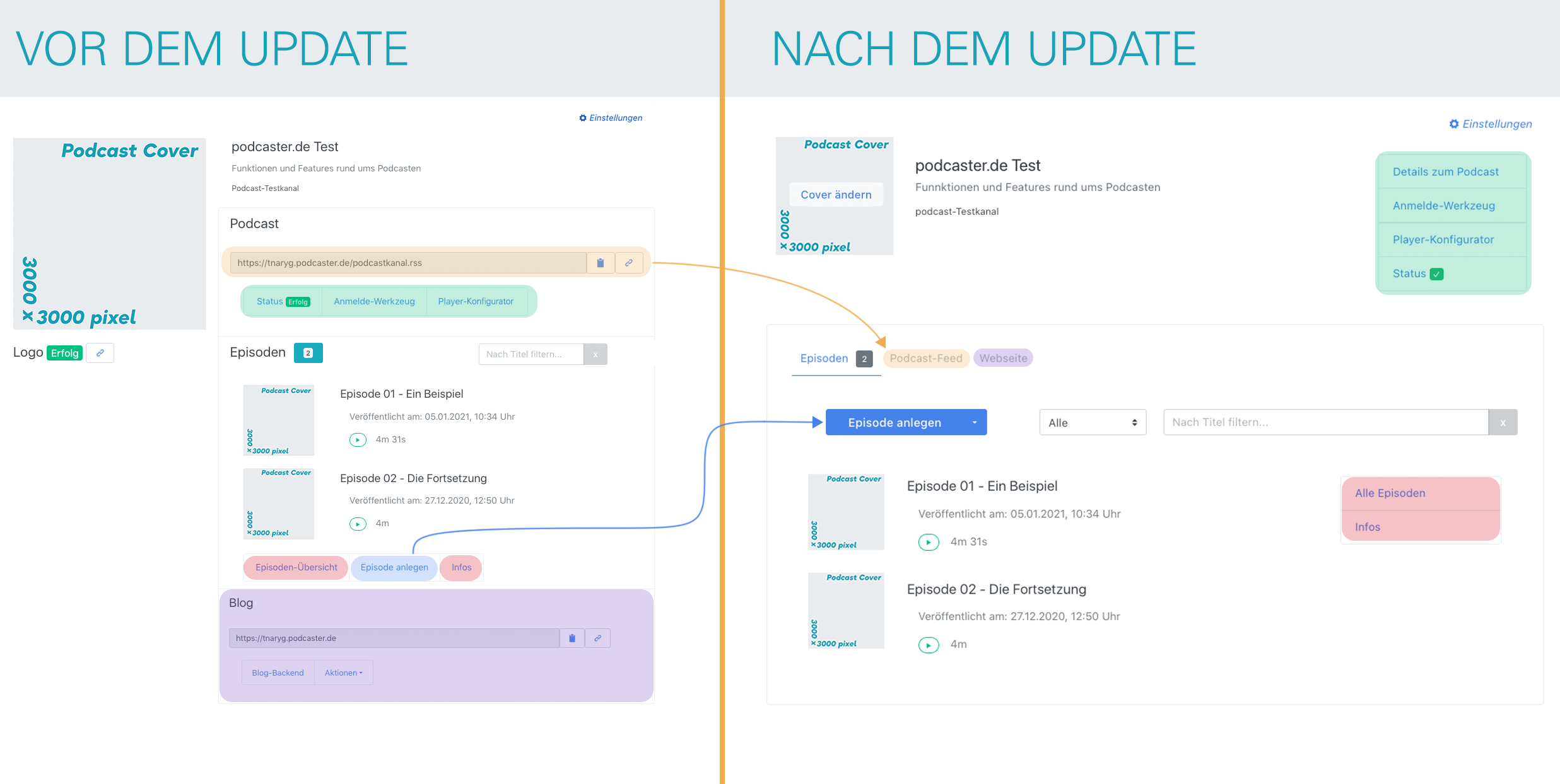 Die Knöpfe Details zum Podcast, Anmelde-Werkzeug, Player-Konfigurator und Status-Check sind jetzt rechts neben der Podcast-Beschreibung unterhalb der ⚙️ Einstellungen (siehe grüne Hervorhebung).