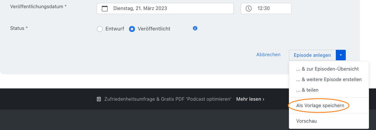 Ihr könnt ab jetzt eigene Episoden als Vorlagen speichern und diese für neu zu veröffentlichende Folgen abrufen. Das beschleunigt den Veröffentlichungsprozess, weil bestimmte Eingaben (z.B. Autor:in oder Teile der Episodenbeschreibungen) nicht jedes Mal neu getätigt werden müssen. Zusammen mit dem Standard für Episoden-Beschreibung und dem Globalen Footer ist dies also ein weiteres Tool, mit vorgespeicherten Inhalten schneller und einheitlicher veröffentlichen zu können.